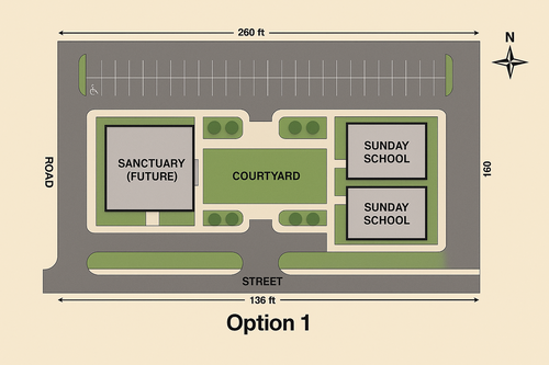 At the end of May, we were able to purchase a vacant lot next to our current facility. It is our hope to be able to add some additional buildings on that lot as well as parking. The site plan you see is a rough idea of what we would like to do as funds permit. This would be done in phases. We would most likely begin with a 40ft x 30ft (2 rooms and a bathroom) Sunday School building and go from there.